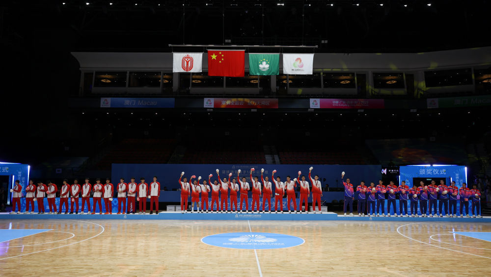 11月18日,在澳门举行的第十五届全国篮球锦标赛男子18岁以下组比赛中,广东队以85-78战胜山东队,夺得金牌。 ^ 广东队(中)、亚军山东队(左)、季军上海队在颁奖典礼上。摄影:新华社记者 孙凡跃 ↑ 颁奖典礼结束后,广东队球员合影。新华社记者孙凡跃供图↑颁奖典礼结束后,广东队队员与杜锋(前右二)合影留念。新华社记者 孙凡跃 供图 ↑比赛结束后,广东队球员庆祝胜利。新湖网记者 孙凡跃 摄 ↑ 比赛结束后,广东队球员将主教练袁远抛向空中庆祝胜利。新华社记者孙凡跃供图↑成员广东队赛后庆祝胜利。新华社记者 孙凡跃 供图 ↑比赛结束后,广东队球员庆祝胜利。新华社记者孙凡跃供图↑广东队队员赛后庆祝胜利。新华社记者周梅供图↑广东队球员夏振峰(前左)赛后与家人拥抱。新华社记者周梅供图↑广东队球员米小吉(左)在比赛中庆祝进球。新华社周梅供图↑山东队球员张博源(左)在比赛中射门。新华社记者孙凡跃供图↑比赛中,广东队球员夏振峰(左一)保护山东队球员谢文正(左二)。新华社孙凡岳供图↑广东队球员冯熙睿(前右))在比赛中扣篮。新华社记者 周梅 供图 ↑比赛中,广东队何文伟(左)突破了山东队姚克友的防守。新华社记者周梅供图↑广东队球员冯熙瑞(右)与山东队球员彭宏森在比赛中争夺篮板球。新华社记者周梅供图↑比赛中,广东队何文伟(左)突破了山东队姚克友的防守。新华社记者周梅供图↑山东队球员张博源(右)与广东队球员冯熙锐在比赛中争夺篮板球。新华社记者周梅供图↑广东队主教练袁云替补训练。新华社孙凡岳供图↑广东队球员米晓杰(左)在山东队球员张博源的防守下上篮得手。新华社报道供图↑ 孙凡跃 ↑ 山东队球员姚克宇(中)在广东队球员吴海波(左)和冯熙儒的防守下进攻。新华社记者 周蜜 供图