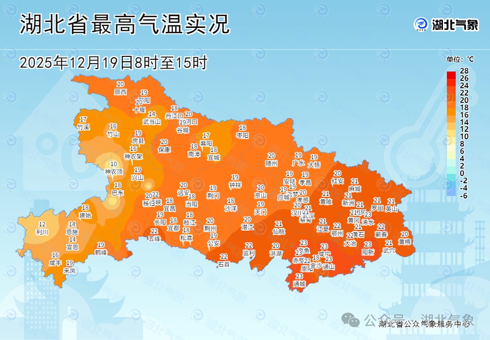 湖北日报讯(记者王京华)近期,雾霾天气持续困扰湖北省。尽管该州大部分地区空气质量较差,但全州气温却大幅上升。下午 3:00 开始19日,我省东部、江汉平原南部、湖北西部部分地区最高气温超过20度。 12月中旬,武汉等东部地区打破了最高气温记录。然而,炎热天气将是短暂的,周末天气将发生“重大变化”。据气象资料最新分析,预计19日下午至20日我州自西向东将有较大降雨。 20日,西部半高寒地区有雨夹雪,高寒地区有中到大雪或局地暴雪,鄂东北高寒地区有雨夹雪,以小雨为主。n 在其他领域。湖北省最高气温实时地图(2025年12月19日下午3:00)米。 12 月 19 日至上午 8:00 12月20日,湖北西北部、湖北西南部、江汉平原南部等地有阴天或小雨。其他地区将是多云。中东部地区有雾。中西部地区最低气温3~7℃,东部地区7~11℃。北风由2级转为3级,阵风由3级转为4级,阵风由5级转为7级。 12 月 20 日至上午 8:00 12月21日,鄂西南、鄂西南等地多云有小到中雨,半高寒及高寒地区有雨夹雪、高寒地区有中到大雪。局部暴风雪。其他地区阴天也将有小雨,湖北省东北部高山出现雨夹雪天气。白天,该国中部和东部地区出现大雾。湖北省西北部地区最高气温在9至13摄氏度之间,其他地区在13至17摄氏度之间,最低气温在2至7摄氏度之间。北风4~5级,阵风6~8级。12月21日8时至12月22日8时,全省多云,湖北西北部、西南地区有小雨,高山区有雨夹雪或雪。湖北西部地区最高气温7℃~13℃,最低气温1℃~4℃,其他地区4℃~7℃。北风2级转东风3级。12月22日08:00至12月23日08:00,湖北东北部、南方东部等地多云转多云湖北省东部。其他地区多云或小雨,湖北西北部高山预计有雨夹雪。哈哈哈。中西部地区最高气温在6℃至11℃之间,东部地区最高气温在11℃至14℃之间。湖北省西北部地区最低气温2至5摄氏度,其他地区5至8摄氏度。东风将转为2-3级北风。